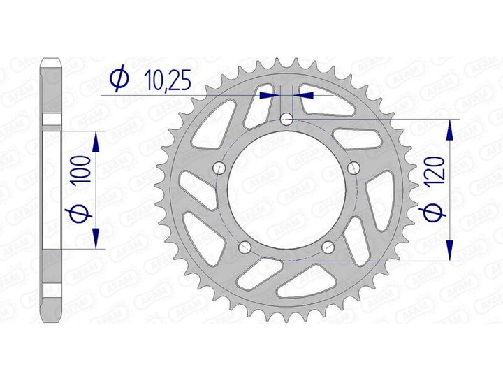 Afam aluminum crown gears are made of an alloy that is both light and tough. The Quality of Machining and the Precision of the Cutting Make AFM A Worldwide Standard Settes for Motorcycle Transmission Parts. Racing Aluminum Crown Gear Ultra-Light with Hard Anodizationreinforced Resistance to free and wearrange-topping Finish and Qualityessential for Competitive Riding Chain_pitch: 525.0 Material: Aluminum Rear_Teet_teeth_CoN REAR_PROET_SSION: Ultra-Light Hard Anodized