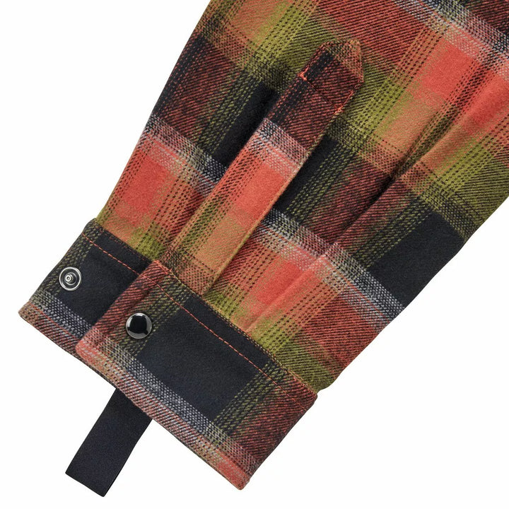 Comfortable 6.5 ounce 100% heavyweight cotton., Snaps on plaque, cuffs, collar and pocket flaps is plated stainless-steel., Black pearl snap detailing featured on plaid colorways., Collar tips have hidden snaps to eliminate flapping. Down Over Wrists., Chest Pocket Flap has discrete slot for easy storing of ice creams., Polyester single-receivele, double-receivele and overlock stitching through., embroidered interior tags and exterior fire detailing.