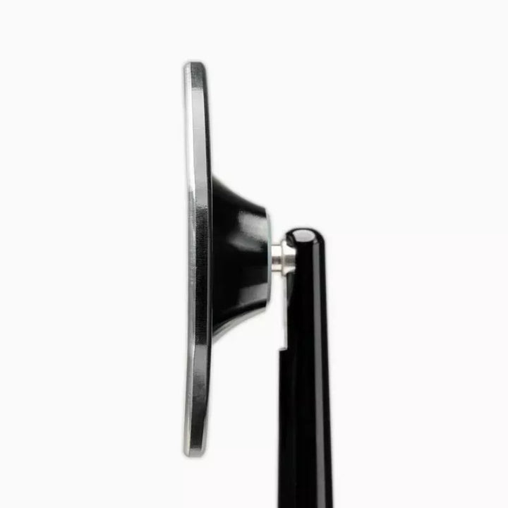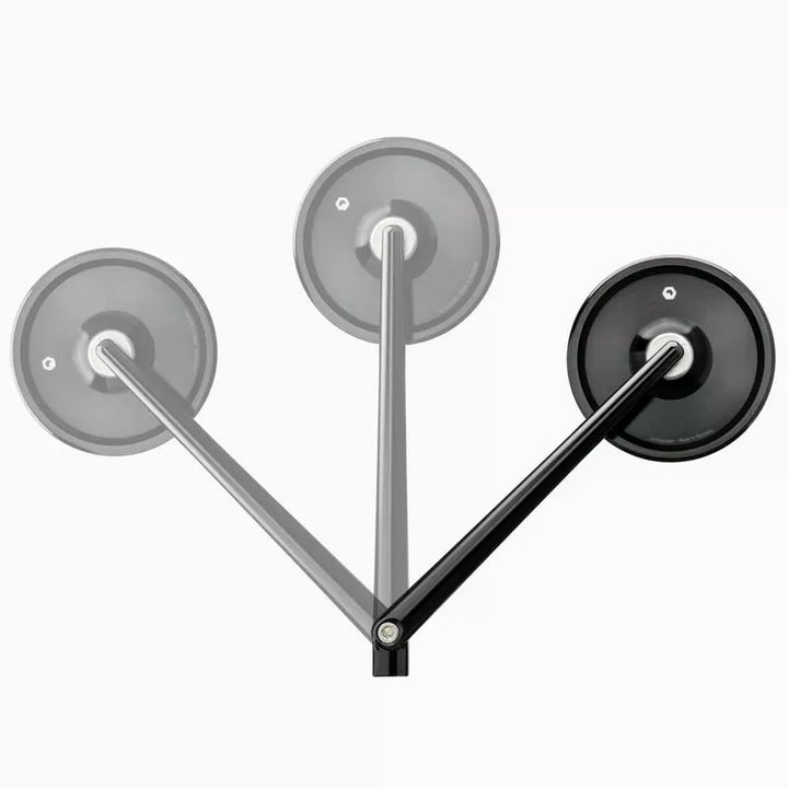 The Mirror with Swivel Mirror Arm and Defined 45 ° Locking Angles is Perfect for Narrow Passages, During Transportation or When there are Space Problems in the Garage., Our Glasless Mirror Series Mo.view is Unique in the World. The Special Feature of Our Mirrors is the Patented Mirror Surface, Which Is Worked Directly From the Metal of the Body. The Aluminum Itself is the Mirror Surface., The Mirror Body Itself Beces Very Thin and Light, Creating a Weightless Design With No Rim or Frame. The Convex Mirror Surface is Manufactured by Fly Cutting Using Diamond Tools On Ultra-precision Machines in Berlin. It is then made resistant to oxidation, corrosion and abrasion by a complex plasma coating in a vacuum., The mirror body and mirror arm are milled from solid aluminum on cnc machines and anodized to a high quality. All Screws are Made of Stainless Steel. The precise ball joints the mirror to be adjusted Comfortable and very stable. Glass Breakage or Glass Falling Out is Simply Not Possible., A Special Feature of the MirRors in the Flip Series is the pivoting mirror arm with defined locking angles at 45 ° intervals. This Allows the Mirror to Be Tilted Upwards As Required Without Changing the Mirror Setting., Extremely Practical for Narrow Passages, Space Problems in the Garage or for Transportation. The Locking Mechanism is Very Stable and Cannot Be Adjusted Accidentally. The Mirror does not vibrate even at high speeds when mounted corractly., The Surface-mounted Mirror Can Be Fitted to any M10 Mirror Thread on the Handlebars. Three Fixing Screws with Different Threads Are Supplied. The Mirror is suitable for the Left and Right Side, Diameter of the Mirror Body: 99 mm., Thickness of the Mirror Body Without Ball Head: 4.5 mm., Length of the Mirror Arm: 180 mm., Weight: Approx. 300 g., Scope of Delivery: 1x Mo.view Classic Flip Surface-Mounted Mirror (With Ece Marking) With Arm, 1 x Screw M10 x 1.5, 1 x Screw M10 x 1.25 Right-Hand Thread, 1 x Screw M10 x 1.25 LEFT-HANDS THREE HAND