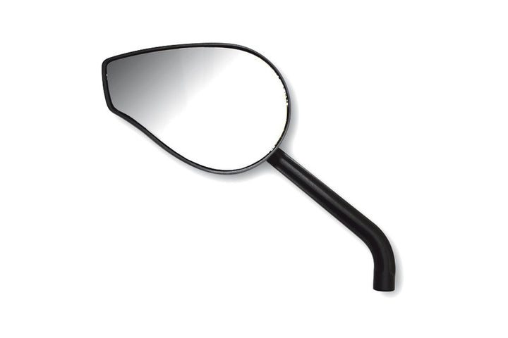 Chrome-plated aluminum mirror with an oval cut head and bent arm. Includes extra adapter for Harley Davidson and for Yamaha, E-approved.