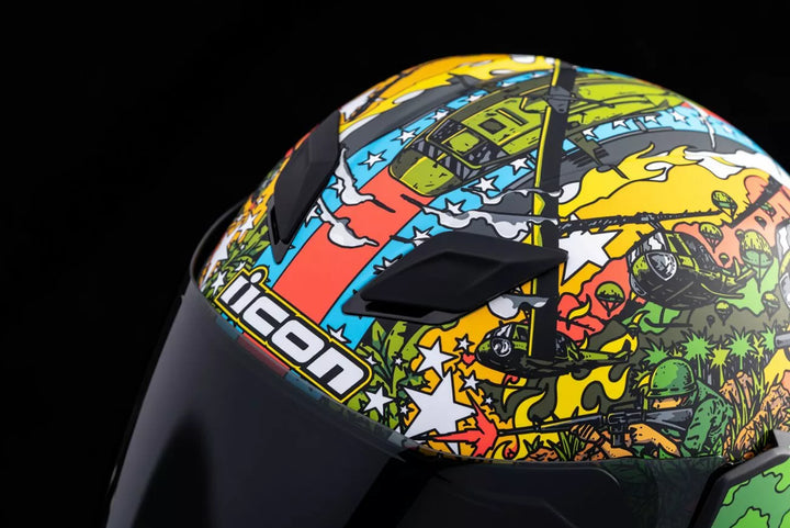 Quick-Change Fog-Free Fliteshield ™ with Sideplates, Injection Molded Polycarbonate Shell for Strength, Multiple Oversized Intake and Exhaust Ports, Fog-Free Dropshield ™ with Exterior Switch, Removae, Removable Mold. Supervent Cooling System, Internal Speaker Pockets Work with Icon's R.A.U. Bluetooth Device, The Dropshield ™ Visor Must Only Be Used While The Main Face Shield Is In The Fully Closed Position, Removable Hydradry ™ Moisture Wicking Liner, Includes Clear Fliteshield ™ & Dark Smoke Smokes Deps.