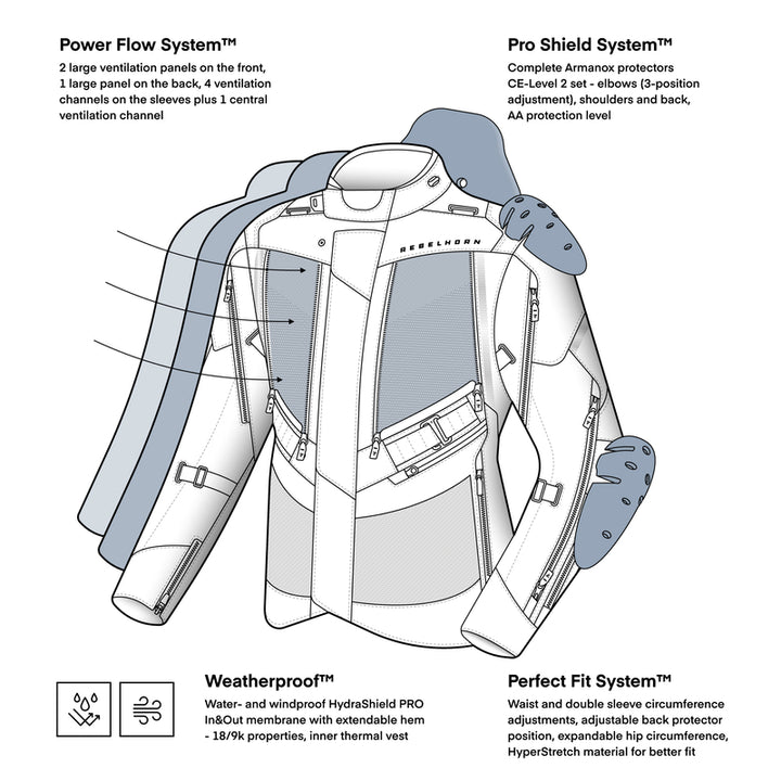 Ready for all roads, all weather, and all adventures – Rebelhorn Hardy 3.0 is the touring jacket that takes comfort, protection, and functionality to a whole new level. It is built for those who don’t let rain, heat, or long miles stand in the way of the next ride. With its advanced 3-layer system, the Hardy 3.0 adapts smoothly to both climate and riding style – whether you are riding to Nordkap or taking a Sunday ride in pouring rain.