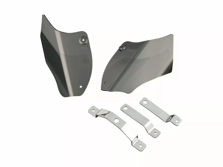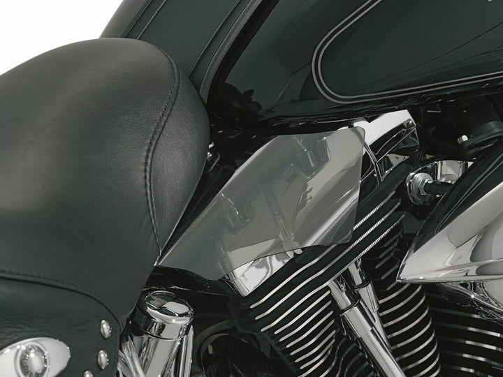 Fram-mounted Polycarbonate Shields Help Beat Engine Heat, Dissipate and Redirect Engine Heat Away From The Rider, Make Riding On Those Hot Summer Days Bearable, Reflective Smoke Tint, Sold in Pairs