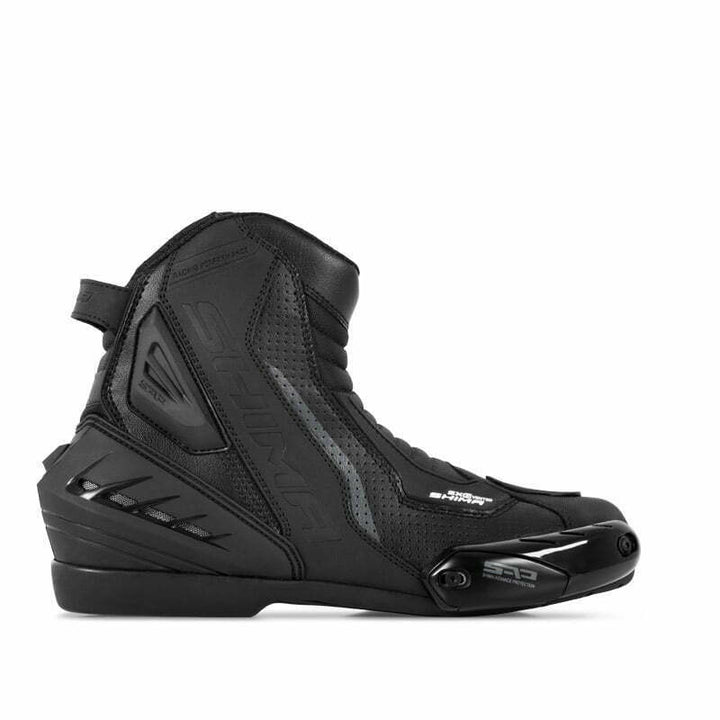 The shoes are made in a slightly inclined position of the upper adapted to the rider's position on the motorcycle while riding. They have an ergonomic rubber sole that stabilizes the leg's position on the footpeg and a shift pad to prevent slipping and wear of the material in this area. SAP controls on the toes make it easier for the rider to lean into corners without fear of grabbing the asphalt.
