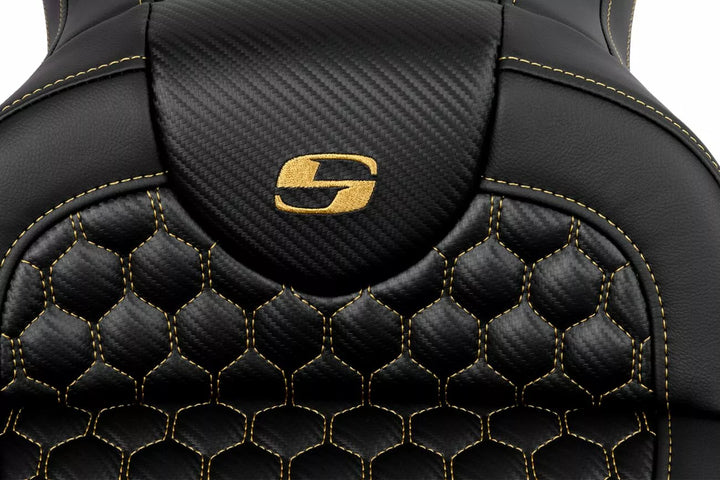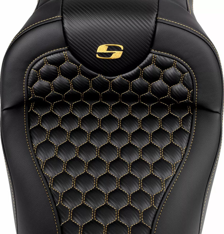 Each Seat Combines a Gel-Core ル Interior and Pro-Foam ル To Create A Foam With A Balance of Compression and Resilience Gear Long Distance Comfort, Pro-Foam ル Unique Molding Process Creates, See Elevae Resistant, Self- Durability as well as Comfort, Honeycomb (HC) Pattern Incorporates Modern Geometry In A Stylish Seat Cover, Saddlegel ル In Front and Real Reduces Tailbone Pressure and Increases Circulation and Comfort for Both Driver and Passenger, Designed and Made in the USA