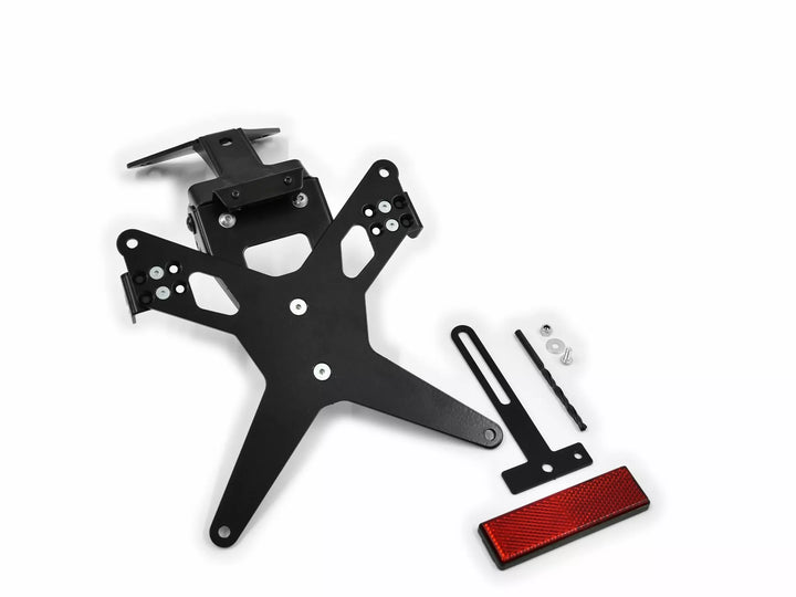 The License Plate Holder is Extremely Durable and Weather Proof., Black Powder Coated. , The License Plate Holder Can Be Used For Any Kind of License Plate (175mm Width)., No Modification of Fairing Required., Stepless Adjustment of Rake Angle., Indicator Support Adjustable in 3 Positions. Plate., Special Indicator Light Mounts (Sold Separately) Required for Stock Indicator Lights., Kit Includes: 1 License Plate Holder Incl. Mounting Kit., LED License Plate Light "e Approved" Incl. Support., Back Light With Support. Disclaimer: Important: For the use of this license Plate Holder with the oem Turn Signals of Ducati Models (2015 - Present) A Special Holder is Needed (Zieger Turn Signal Adapter oe Duc. Parts Europe Part Number: 20301971. Vendor Number: 10005790).