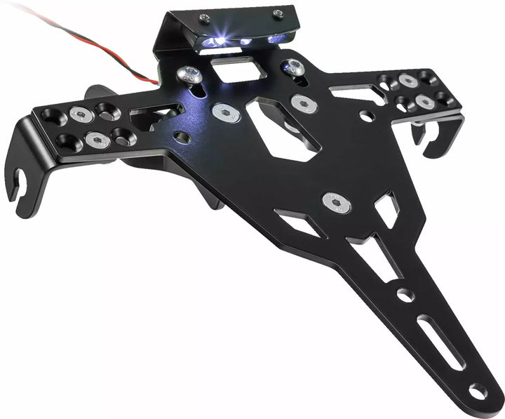 The License Plate Holder is Extremely Durable and Weather Proof., Black Powder Coated. , The License Plate Holder Can Be Used For Any Kind of License Plate (175mm Width)., No Modification of Fairing Required., Stepless Adjustment of Rake Angle., Indicator Support Adjustable in 3 Positions. Plate., Special Indicator Light Mounts (Sold Separately) Required for Stock Indicator Lights., Kit Includes: 1 License Plate Holder Incl. Mounting Kit., LED License Plate Light "E Approsved" Incl. Support., Back Light With Support. Of: Germany, Slovenia, Croatia & UK.
