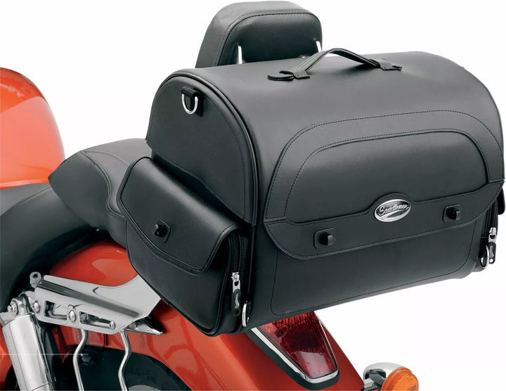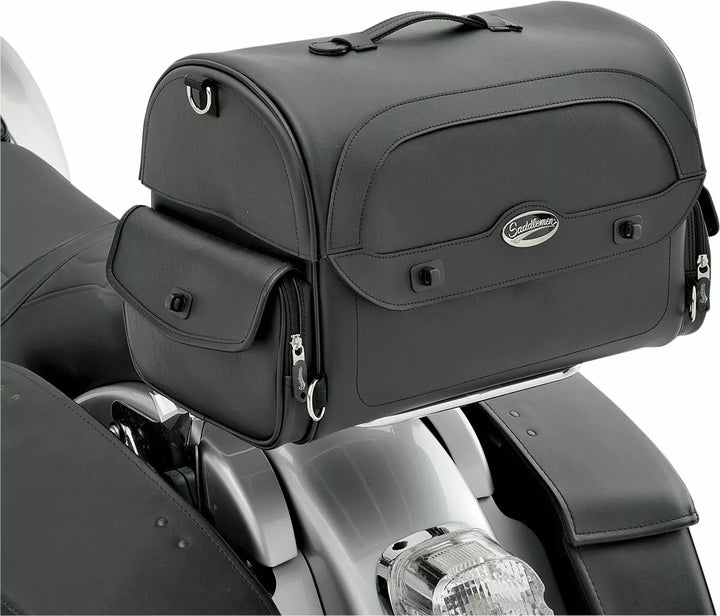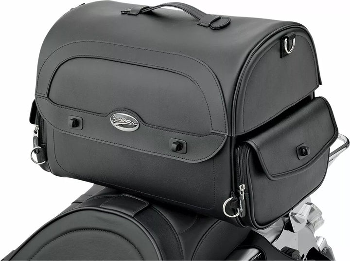Bolsa de cauda de estilo elegante, feita de painéis robustos de sela e reforço de plástico, a construção rígida mantém essas sacolas parecendo boas ou vazias, projetadas para várias opções de montagem adaptáveis a qualquer bicicleta; Attaches to sissy bar, rack or atop passenger seat, multiple anchor points, including four heavy-duty chromed d-ring and several strap slots provided for solid, easy mounting, rived top handle and removable spine lids strap for convenient transport Protection Against Weather, Grime and Other Elements, Easy-Open Lid Provides Convenient Access, Two Zippered and Flap-Covered Side Pockets Provide Extra Storage, Hanging Internal Mesh Pocket Provides Separate Storage Inside Bag and Helps Organize 16 bolsos