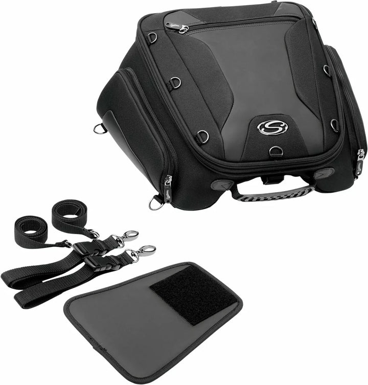 Fits Rear Seat/Pillions With Included Mounting System, Rugged 1200 Deniers Saddletuff ™ Construction For Long Life, Large Main Compartment Spacious Enough for Laptop or Notebook Computer, Three Internal Pockets and Three Big Exterior Pockets Easy Allows Easy Access Expand an Additional 2 "For Extra Storage, Water-Resistant Construction with Integrated Rain Cover, Thirteen Exterior D-Rings for Attaching Other Items Like Jacket or Other Luggage (Six Conceled D-Rings to Prevent Arranhando), o organizador da tecnologia para smartphones, as tiras de concha podem ser abertas a 180 ° de 180 °, a alça de transporte confortável permite que a bolsa seja usada como uma mala quando fora da bicicleta, a construção semi-dolorosa tem forma e parece ótima, mesmo quando vazias, incluindo a área de fora, as sacolas podem ser removidas e reutilizadas dentro de segundos usando uma série de linhas de came
