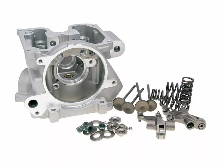 Cabeça de cilindro de 4 válvulas Naraku Racing com câmara de combustão de 62 mm para saciar seu apetite por energia, aumento do fluxo, molas de válvula reforçada e válvulas maiores (21/33mm), adequadas para a Yamaha X-Max, Wr, Wr, Wr, Yzf-U 125 ou sistema de injeção de combustível deve ser re-tumível (Z. B. B. com inimigo, inimigo) Naraku NK600.74, Polini 166.0101, Malossi M.3114852 e outros cilindros 62mm, válvulas de admissão: válvulas de escape de 23 mm: 21mm, novos modelos têm a conexão com sensores de lambda diretamente na saída (isso deve ser fechado em modelos mais antigos), escopo de entrega sem caçadores de câmeras de rolagem