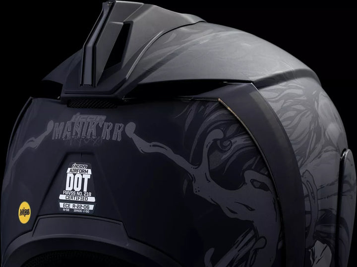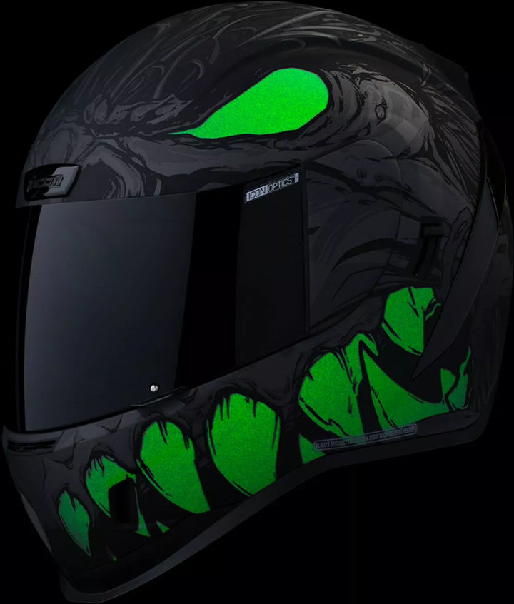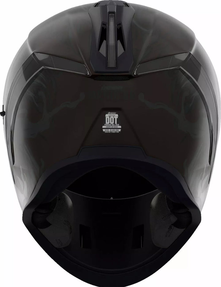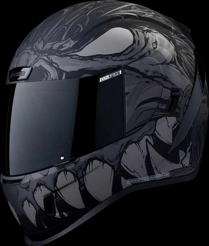 Continuous Venting System, FAG-FREE ICON OPTICS ™ Shield with Rapid-release ™ System, Injection Molded Polycarbonate Shell for Strength, Internal Airflow Geometry, Sculpted NECK Roll, Prolock ™ Switsch, the EXTERIOR WITH LOCKING SHIVING SWEQU Visor must only be used while the main face shield is in the fully closed position, removable Molded Breath Deflector, Removable Hydradry ™ 3-Piece Moisture Wicking Liner, os bolsos internos do alto -falante trabalham com a R.A.U. do ICON. Dispositivo Bluetooth, inclui Dark Smoke Dropshield ™ e Rubatone Black Speedfin ™
