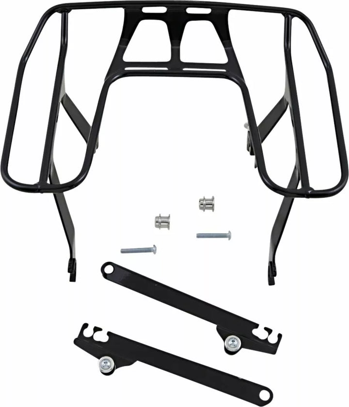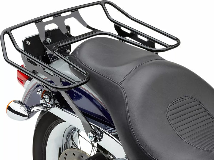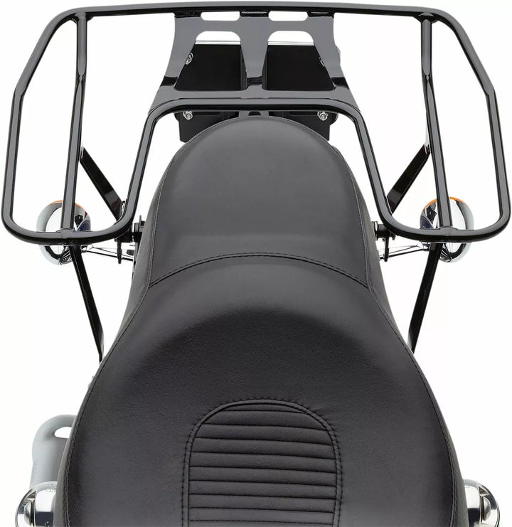 A parte superior do rack está no nível da parte superior do assento e cada rack tem um chute na parte traseira, há lugares para prender cordões de bungee ou tiras de montagem, para que você não precise mais arranhar o pára -choque do Fen S à medida que protege sua carga, montando hardware. Kit de montagem da Harley-Davidson., Se o assento do mercado de reposição não for Saddlemen ou Lucky Daves Step Ups, olhe carnamente para as medidas da abertura para garantir que o rack se encaixe no assento da sua bicicleta.