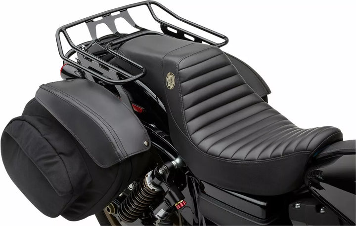 A parte superior do rack está no nível da parte superior do assento e cada rack tem um chute na parte traseira, há lugares para prender cordões de bungee ou tiras de montagem, para que você não precise mais arranhar o pára -choque do Fen S à medida que protege sua carga, montando hardware. Kit de montagem da Harley-Davidson., Se o assento do mercado de reposição não for Saddlemen ou Lucky Daves Step Ups, olhe carnamente para as medidas da abertura para garantir que o rack se encaixe no assento da sua bicicleta.