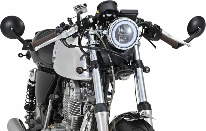 Grampo de diâmetro interno: Ø 30mm, incl. 2 espaçadores (22,2 e 25,4 mm) para montagem direta, braço de espelho de material: alumínio, adaptadores de extremidade da barra opcional podem ser usados, cabeça de espelho de material: alumínio com superfície CNC ou ABS