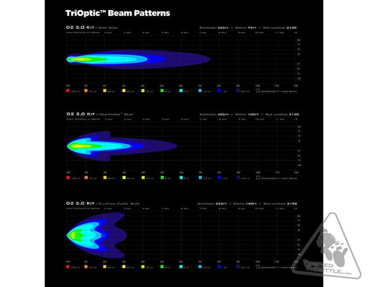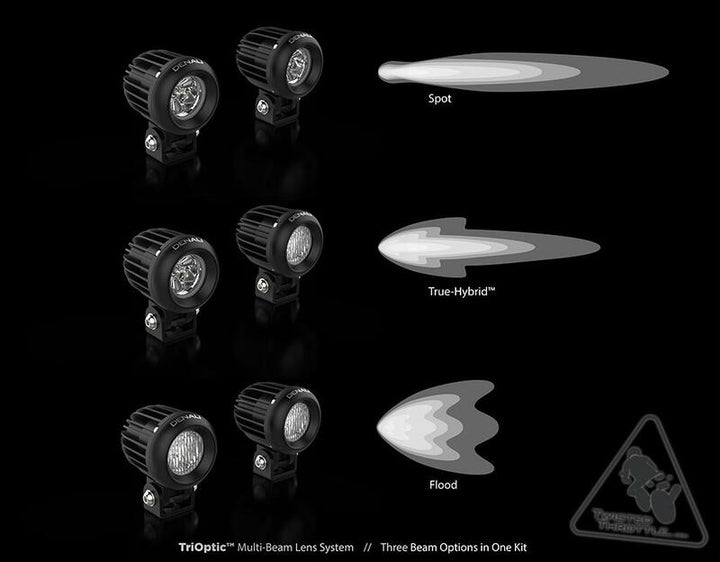 O sistema Trioptic ™ Permite que você mesmo personalize a imagem de luz. Cada lâmpada vem com ambos Spotlins (pré -instalado) e Lente de inundação (extra incluída).