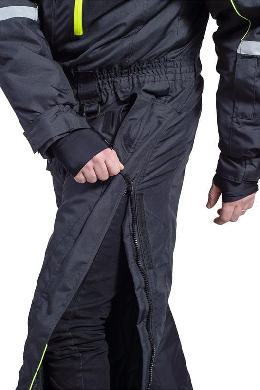 Possui um capuz destacável, uma boa trava de neve no fechamento das pernas e o zíper da decisão ao quadril para acomodar botas e para uma entrada simples.