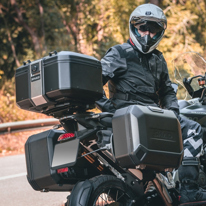 A Terra TR55 Black Edition Top Case tem capacidade para dois capacetes flip-up e se destaca, é a caixa de alumínio mais leve no mercado a 5,4 kg. Projetou e fez 100% em Barcelona. Seu design inovador minimiza o impacto visual na motocicleta. A versão Terra Black Edition é finalizada com tinta preta mata resistente a arranhões. O Terra TR55 Top Case foi concedido com o ABC Awards, graças ao seu design focado em resolver aspectos -chave para o uso em motocicletas de aventura. Possui uma estrutura aerodinâmica e integrada feita de uma liga de alumínio endurecida, uma luz mais forte e a luz de alumínio que atende uma seção transversal reduzida de 1,2 mm para obstruir o peso mínimo com resistência máxima. Como em todos os casos de alumínio de terra, o 'sistema de tampa de terra' (patente pendente) está incluído. Com uma estrutura de aço inoxidável AISI 304 de grau industrial, que inclui o sistema de trava e uma alça de transporte retrátil. Essa estrutura foi projetada para uso rápido e de uma mão e permite que o usuário abra, feche, remova e transtenha o estojo em segundos. As dobradiças de aço inoxidável AISI 304 também estão disponíveis. A estrutura selada de borracha do gabinete protege o interior de condições climáticas desfavoráveis (resistência à água). Além disso, a base de espuma interna reduz o movimento da carga dentro. As teclas e o cilindro de bloqueio do TR55 são a versão premium da Shad, com um sistema que reduz a chance de roubo, bem como uma capa que impede a entrada de poeira. Existe a opção de adicionar carga adicional graças aos seus ganchos externos de aço inoxidável AISI. A instalação de um master shad top e uma placa de montagem (não incluída) é necessária. Existem três opções de placa de montagem: placa padrão de shad (D1B591PA), placa de montagem de alumínio (D1BTRPA) ou a placa de montagem de alumínio preta (D1BTRPA2). Os cilindros de trava são facilmente alterados: os casos superior e lateral podem ser unificados para uso com uma chave em menos de 5 minutos. Um terceiro cilindro está incluído para o estojo superior no caso do lado direito. Acessórios (não incluídos): backrest de duas peças (D0RI75) e bolsa interna expansível (X0IB10).