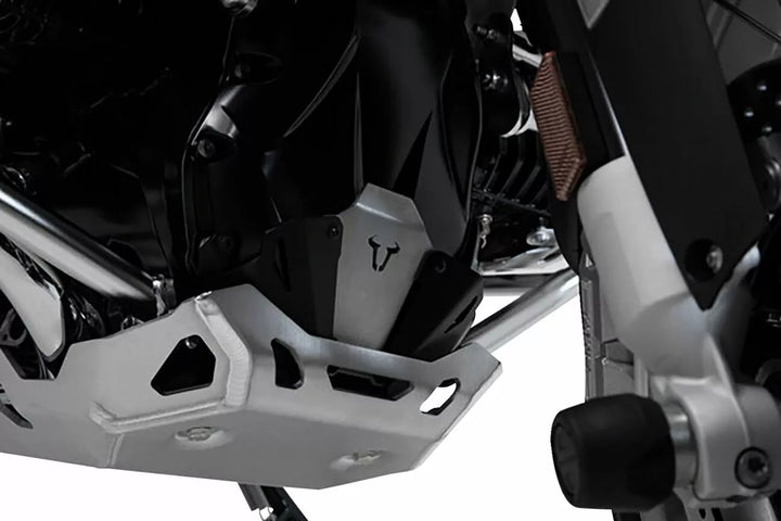 Protege a área frontal do bloco de motor de lascas de rocha, estende o guarda do motor em frente ao bloco do motor em até 130 mm, pode ser montado por conta própria ou além da guarda do motor SW-Motech, inclui hardware e instruções de montagem