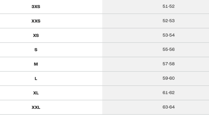 XS (54–55 cm) - S (55–56 cm) - M (57–58 cm) - L (58–59 cm) - XL (60–61 cm) - 2xl (62–63 cm)