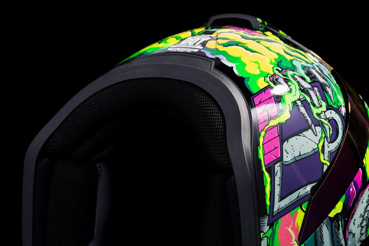 Casca de policarbonato moldada por injeção para resistência e durabilidade, figura de cabeça intermediária, escudo optics ™ sem nevoeiro, escudo de optics ™ INCLIENTO INCLUÍVEL INCLUÍVEL, Sistema de travamento de fumaça escura, linguejamento de fumaça de fumaça escura, laminador de rolos PHELOK ™ Removable Confort Linner, RST ROXT Spoiler Kit, Syemuous System Systems Sysy Systemfily Systerfolfolfoll Removable Liner Remons, spogueiro Sporuio Sporuio O Optics ™ Shield está com uma alta elevação rápida da posição totalmente fechada, defletor de respiração moldado removível, o trabalho do Pocket Pocket, do alto-falante interno, com o R.A.U.U. do ICON. Dispositivo Bluetooth