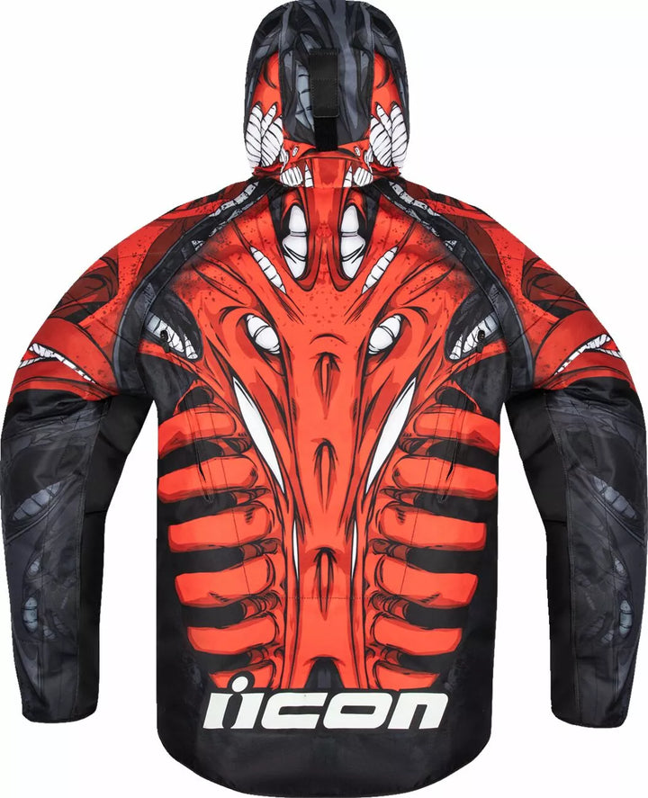 Airform Manik'r ™ Gráfico na frente e traseira da jaqueta, chassi de poliéster 420D com 300D Material de concha de reforço interno de poliéster, com acabamento DWR, protetor traseiro de Viper removível D30; Protetores de impacto de cotovelo e ombro, capô de cordão de cordão de bungee, painel de malha frontal de arfly ™ central com aberturas de tórax e traseiro com zíper, zíperes de punho ventilado, protetor traseiro EN 1621-2 Nível 1