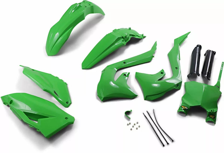 Inclui Fender Fender Front, placa de número frontal do estádio, mortalhas de radiador de fluxo de power, painéis laterais, pára-choque traseiro e guardas de garfo (a menos que indicado de outra forma), moldados por injeção para ajuste e acabamento precisos, fabricados nos EUA.