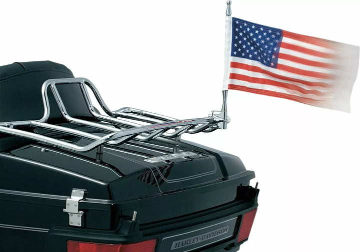 Mount se encaixa na maioria dos racks de bagagem ou em qualquer tubulação de 1/2 ", incluindo trilhos de pára-choque dianteiro, o ângulo de pólo da bandeira é vertical (não ajustável), inclui bandeira americana de 6" x 11 "e uma bandeira de 6" x 9 "Pow/mia