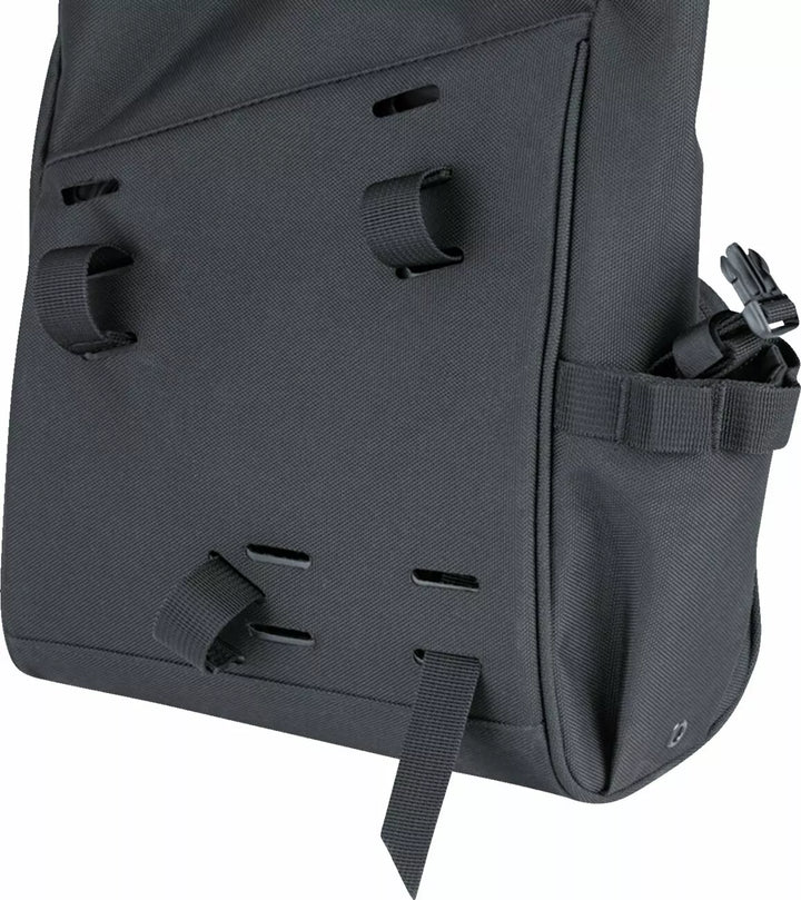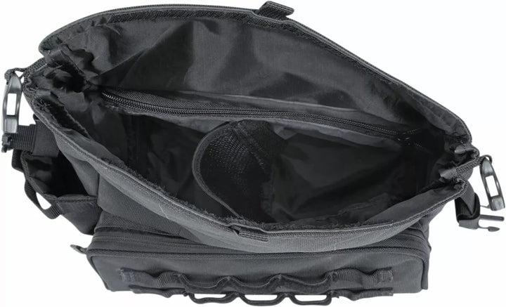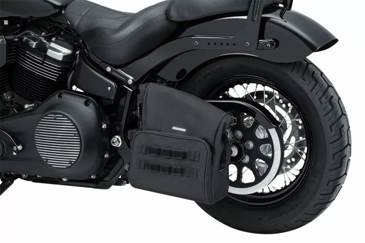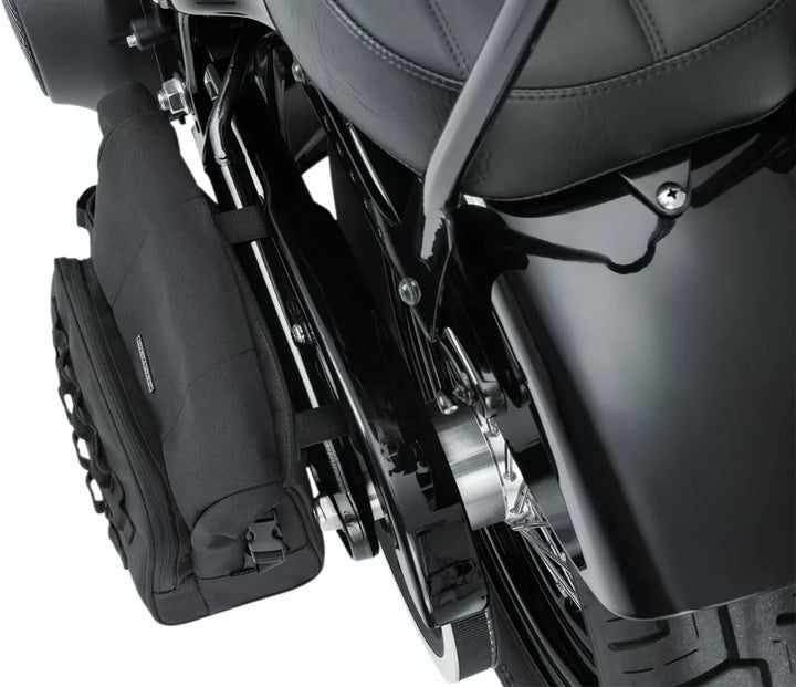 Secure roll-top design offers easy access while mounted, plus added protection from the elements, Made from UV-rated, weather-resistant 1200 denier textile, Interior liner keeps main storage free of debris and moisture, Rigid bottom-end design provides shape retention, durability and protection from the elements, Mounts to virtually any exposed triangle-style (Softail) Swing arm, Secure Safety-Focused Strap System Keeps Slap to Avoid Potential Belt/Chain Interference, Compartimento Externo com zíper mais Molle Molle Molle Molletm polegadas cúbicas, UE: mede 14,75 l