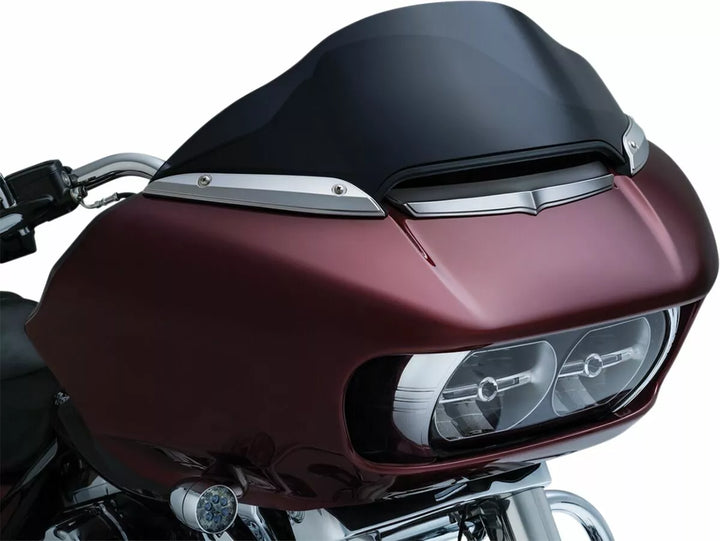 Aumenta a transição do pára-brisa para a carenagem nos modelos de deslizamento da estrada, feitos de abdominais leves e moldados por injeção, a instalação das peças de acabamento preto brilhante reutiliza o hardware OEM enquanto a versão do Chrome vem com stainss de aço substituindo Scree