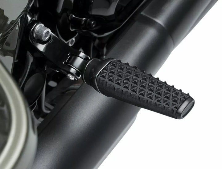Caixas de alumínio aerodinâmicas combinadas com borracha EPDM macia e adaptadores de aço resistente, a borracha serrilhada possui um design inspirado em dentes de tubarão e oferece tração ideal, ajuste universal para todos os montagens de pagos da rodovia Kuryakyn (não se encaixa no OEM Drive