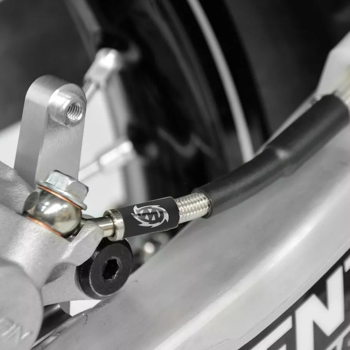 A linha de freio consiste em revestimento de mangueira de extensão sem costura com uma trança com fio de aço inoxidável que é protegida por uma cobertura de PVC durável e leve., Banjos de aço inoxidável são usados para eliminar qualquer possível corrosão, as linhas de freio que são usadas. Sentimento de linhas de freio de plástico padrão., Essas linhas de freio são projetadas para substituição original