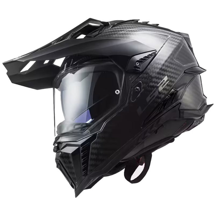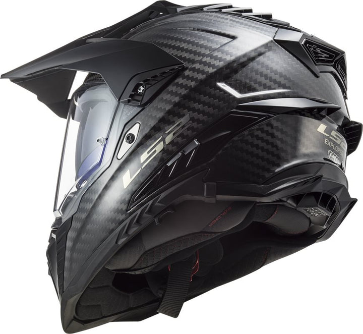 LS2 Adventure Mc-Hjälm Explorer Carbon med kolfiberdesign och visir, perfekt för stad och offroad. Finns i flera storlekar från XS till 3XL.