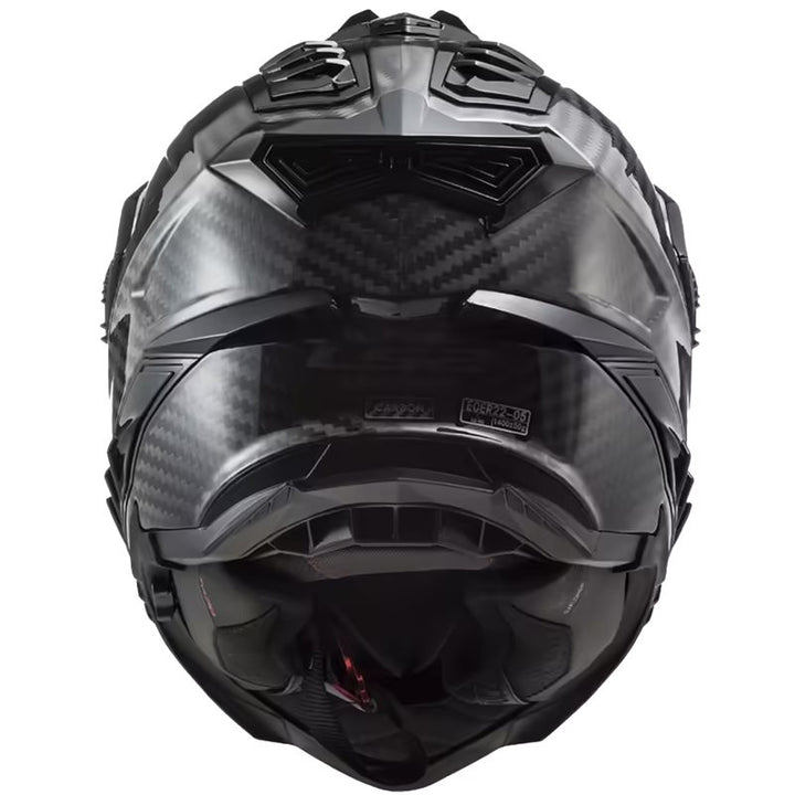 Baksida av LS2 Adventure Mc-Hjälm Explorer Carbon med detaljerad kolfiberfinish och ventilation för maximal komfort.