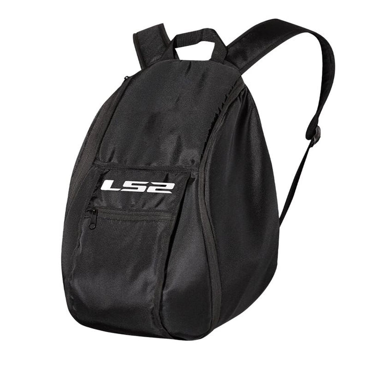 Svart LS2 hjälmväska med justerbara axelremmar och logotyp, idealisk för säker förvaring av LS2 Adventure Mc-Hjälm Explorer Carbon.