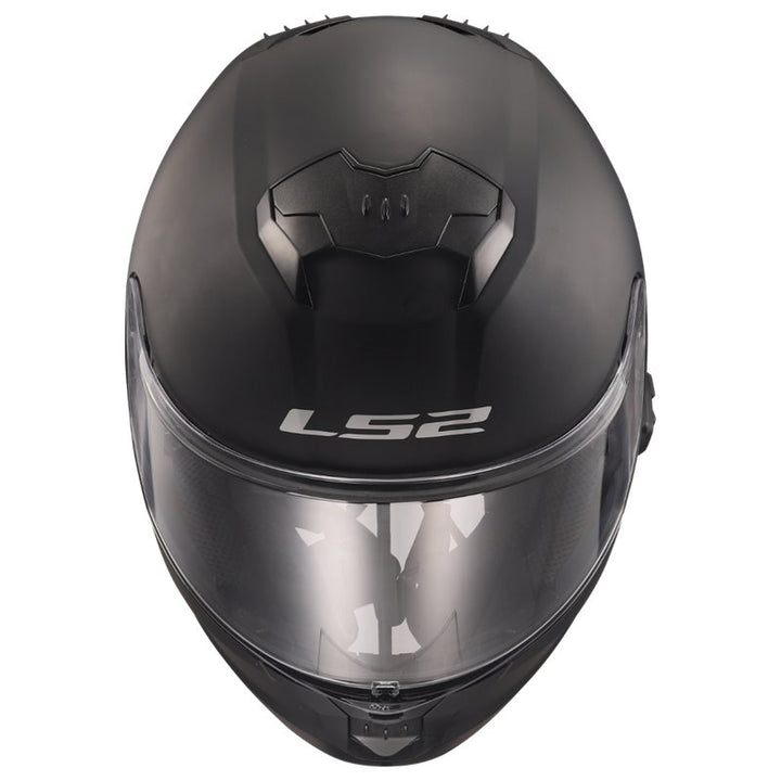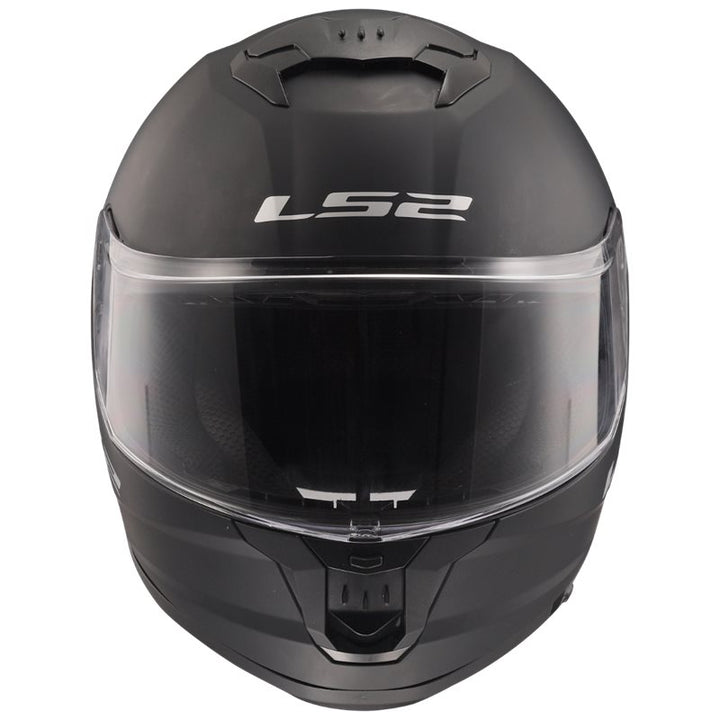Frontal vy av LS2 Integral Mc-Hjälm Stream II Matt Svart med klart visir och robust konstruktion för optimal säkerhet.