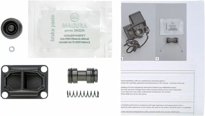 Tudo o necessário para uma revisão completa do cilindro mestre, o kit inclui pistão com focas e mola, fole do pistão, fole de recipiente, anel de vedação para parafuso de montagem de pistão e pasta de freio de silicone