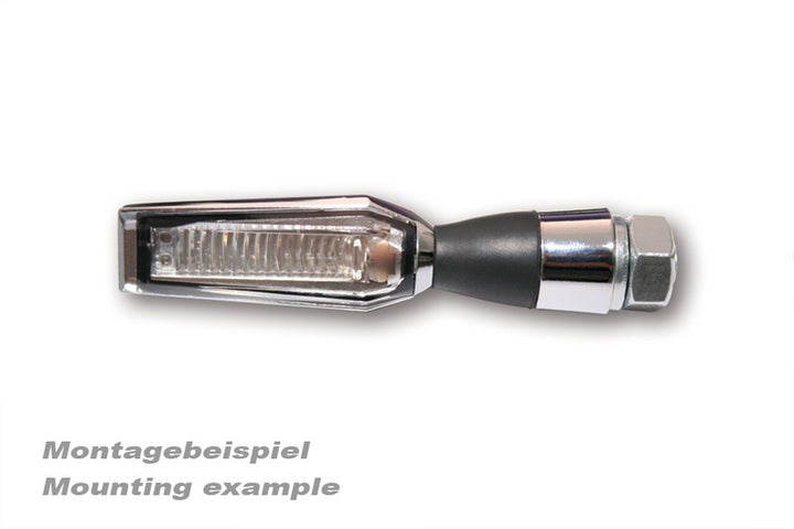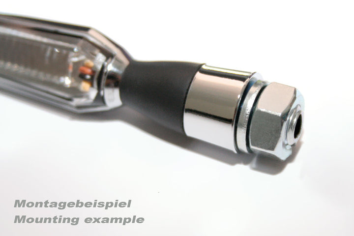 Manga de espaçador de alumínio para quase todos os indicadores com um parafuso rosqueado M8 do Highsider. Um slot na manga facilita a passagem dos cabos. Pode ser usado Eiter como uma extensão do sinal de giro ou como espaçador se o parafuso rosqueado no suporte da lâmpada dever atingir o interior da casa da lâmpada, prendendo -o ao suporte da lâmpada.