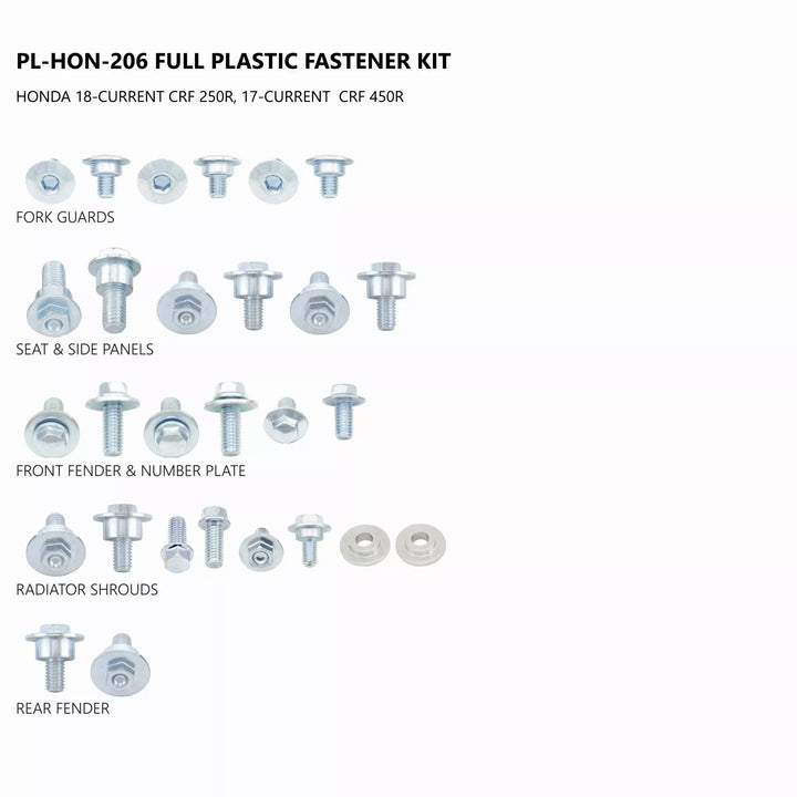 Inclui todos os prendedores e buchas de réplica de fábrica para pára -choque dianteiro, pára -choque traseiro, placa de matrícula frontal, guardas de garfo, assento, painéis laterais e encaixe do radiador em um conjunto