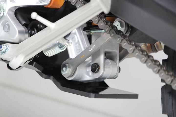 Feita de HDPE de plástico de 8 mm de espessura, a placa de skid de aventura passou com sucesso no teste de pista e protegerá sua máquina da melhor maneira! Proteção de quadros, casos, bomba de água e também a ligação. O AXP Skid Plate pesga 2,55 kg e absorve impactos e deformações. Você vai ficar quão silencioso o plástico é comparado às placas de liga. Feito para o modelo europeu Euro5, esse modelo também se encaixará no quadro anterior, mas com uma lacuna mais importante na frente.