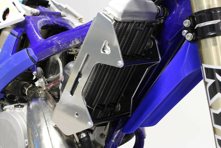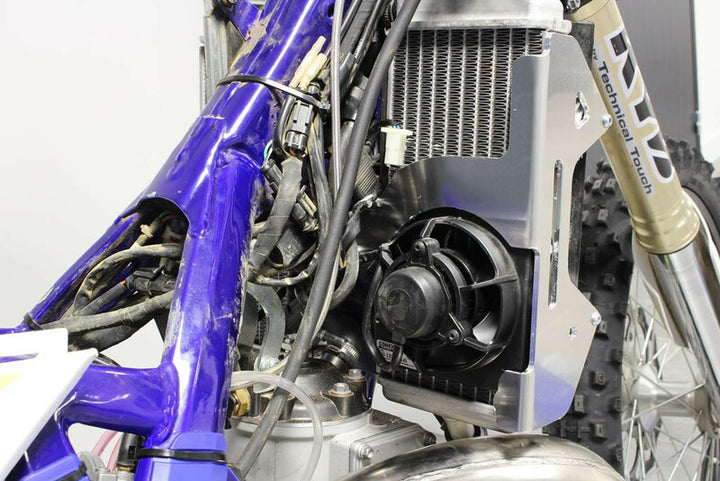 Os guardas do radiador AXP são feitos de alumínio de 4 mm de espessura com um sistema de fixação de 3 pontos. Eles se encaixam com o ventilador Sherco e o peso completo é de 0,850kgs. A parte que vem atrás do radiador é contra a parte central do quadro para obter um máximo de rigidez. Compatível com os defletores de ar de plástico OEM. Cor: Alumínio e preto
