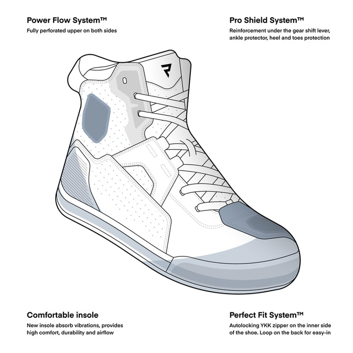 Com um suave zíper Na página, fica fácil vestir e desligar os sapatos, mesmo que você tenha luvas. Para uma visibilidade extra, incluiu um par Cordões reflexivos Isso o torna mais visível em condições sombrias. Para completar o visual, Vandal II se encaixa perfeitamente com jeans e Jaqueta Vandal Rebelhorn, que cria um motoflutfit elegante e coerente.