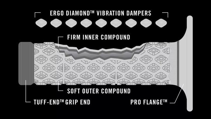 Flange Pro criado para reduzir a abrasão do polegar interno com base em feedback extenso do piloto, composto externo macio e composto interno firme, amortecedores de vibração Ergo Diamond ™, Tuff-End ™ Grip final