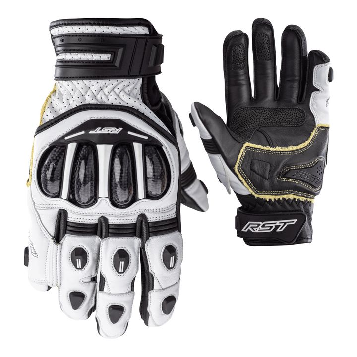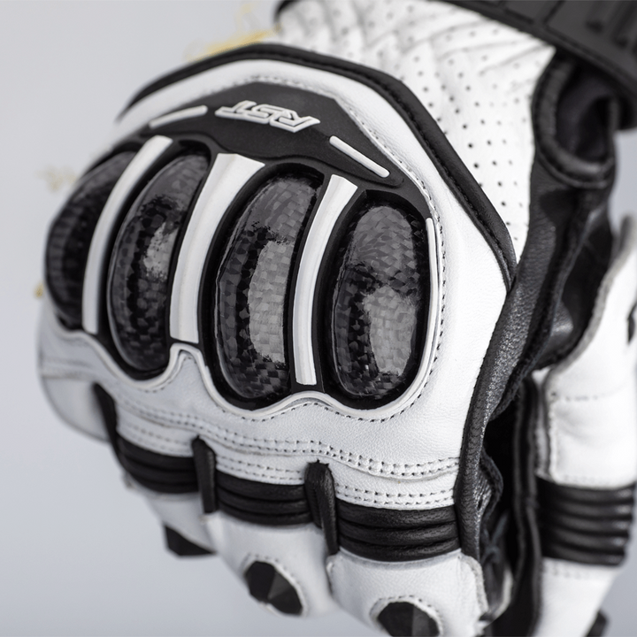 A luva é feita de couro de grão integral e cangurus e possui um protetor de junta de carbono de nível 1 para proteção de choque. A fibra Kevlar® Dupont ™ na palma e no substrato, juntamente com cangurus de duas camadas e um RST Palm Control protege a palma em caso de lâmina de alta velocidade. Os dedos elásticos unidos para evitar o "rolo dos dedos" sem afetar o alcance ou a flexibilidade ao substituir a engrenagem e o fechamento do gancho e do loop fornece um ajuste seguro.