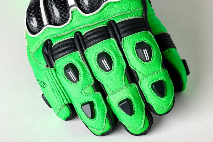 Feito com couro de grão completo e couro de canguru, a luva possui um protetor de junta de carbono de nível 1 para proteção de impacto. A fibra de aramida na costura de palmeiras e na base, juntamente com o couro de canguru de camada dupla e um primeiro controle deslizante de palmeira protegem a palma do palmamento no caso de uma lâmina de alta velocidade, enquanto o punho duplo e o fechamento do manguito oferecem um ajuste seguro. O revestimento de aramida de Dupont ™ por todo o restante da luva evita rasgar, e os dedos conjuntos elásticos para evitar o "rolo dos dedos" sem afetar o alcance ou a flexibilidade ao trocar a engrenagem.