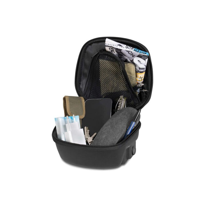 Dentro da tampa, há um compartimento de malha com zíper para armazenar itens. O compartimento principal possui um painel de malha para minimizar o movimento do conteúdo. Possui zips adequados para uso com luvas. Ele tem uma alça de transporte, alça de ombro e elementos reflexivos para aumentar sua visibilidade para outros veículos.