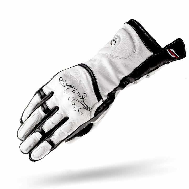 O modelo é projetado especialmente com base na estrutura anatômica da mão de uma mulher, ou seja, dedos mais longos e estreitos e um intermediário e pulso mais estreitos. Duas tiras de ajuste são presas com velcro e um manguito elástico longo permite que você adapte a luva à sua mão. As luvas são feitas de couro natural de alta qualidade. O modelo Shima Moderna também recebeu designs femininos delicados na parte de trás da mão.