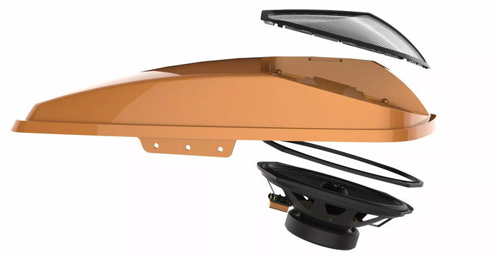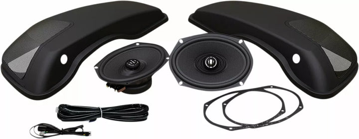 SPEAKERS Angled Toward Rider for Best Sound, Includes 200 Watt 2 Ohm XL Series 6x9 ヤ Speakers Made for Motorcycle Environment, Speakers Feature Carbon Fiber Woofer Cones, Better Bass Response and Allows for Higher Power High Quality) Factory Latch/Lock Mechanism Bolts Into New Lids, Built-in Water Drainage System Keeps Everything Dry, Comes Matte Black, Primed and Ready For Paint, Metal Mesh Grills, Gaskes, Grommets, Wire Harness and All Require Hardware é amp de hogtunes inclusivo ou outro amplificador, um amplificador é necessário para a operação adequada