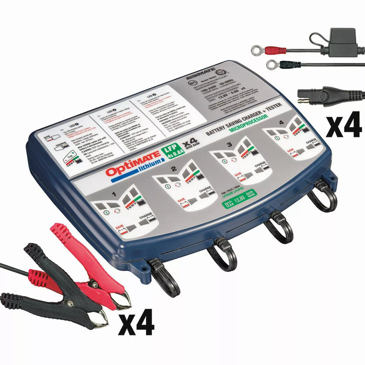 Opticate Lítio 4S 0.8A Quad Bank Série Lithium: 8 etapas 12,8V 0.8A Carregador de economia de bateria selado e mantenedor X4., A escolha ideal para baterias de lítio de até 4 x 12,8V / 13.2V LIFEPO4 / LFP. Choice dos revendedores / revendedores de bateria!, Negância por 4x 12,8V / 13.2V LIFEPO4 / LFP As baterias., Os bancos de carga são eleiticamente isolados um do outro e operam de forma independente. Carregue a bateria separadamente ou carregue a bateria conectada em série!, O BMS reative a bateria do modo de proteção do sono ou descarga profunda. Conecte -se à bateria e opte o lítio 4S 0.8A Quad Bank faz o restante, sem necessidade de supervisão!, Seguro para deixar conectado. Proteção eletrônica completa., 24/7: mantém a bateria com carga total e boa saúde., Recuperação de baixa tensão a partir de 0,5V., S.O.H.: Testes o estado da saúde da bateria., Teste: alerta quando a bateria: Greege é detectada. Stand-a-BY POWER MENOS 0,5W E MANUTENÇÃO EFÉRIA DE BATERIA 24-7., IP54: Proférico do tempo. Classificado para uso em -40 ° C / -40 ° F.