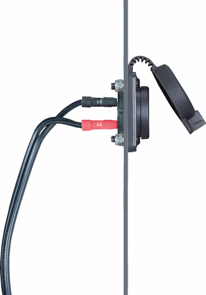 O chicote de conexão da bateria inclui proteção de fusível em linha (fusível 15A ATO) e tamanho duplo (5/16 ”| 3/8”) terminais de chamada para fixação direta aos postes/terminais da bateria, porta magnética Magcode 12V, classificada em 15 amperes, com painel munt kita kit kit & har. Recebe um clipe de 12V de Magcode para receber cobrança ou delinear até 15 amperes de energia, fornece uma conexão de carregador de bateria magnética de curto-circuito e auto-encontrar a conexão com a bateria