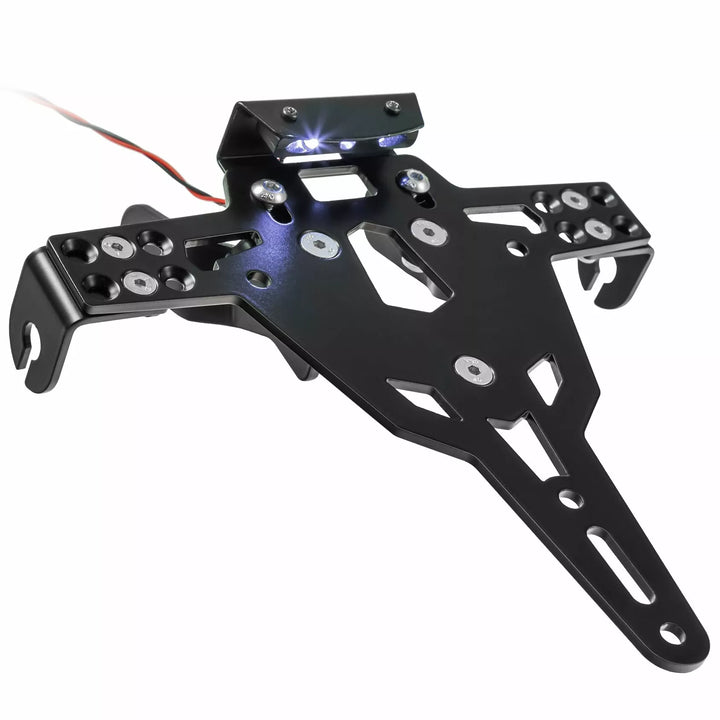 O suporte da placa é extremamente durável e à prova de intempéries., Pó preto revestido. , O titular da placa pode ser usado para qualquer tipo de placa (largura de 175 mm)., Nenhuma modificação da carenagem necessária., Ajuste de rolagem do ângulo de ancinho., Suporte ao indicador ajustável em 3 posições. Placa., Indicador Especial Montagens de luz (vendidas separadamente) necessárias para as luzes indicadoras de estoque., Kit inclui: 1 suporte da placa incl. Kit de montagem, luz da placa LED "E apropriada", incl. Suporte., Luz de volta com suporte. De: Alemanha, Eslovênia, Croácia e Reino Unido.